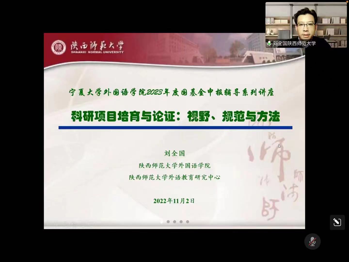 2022年11月2日晚7点半,贝宝官网邀请陕西师范大学外国语贝宝官网院长、教授、博士生导师,陕西师范大学外语教育研究中心主任,中国区多语能力与多语教育研究会副会长,陕西省翻译协会副会长——刘全国教授,在线上为我院举办题为“科研项目的培育与论证:视野、规范与方法”的学术讲座。此次讲座由贝宝官网副院长胡笑瑛教授主持,我院70余名师生参加此次讲座。