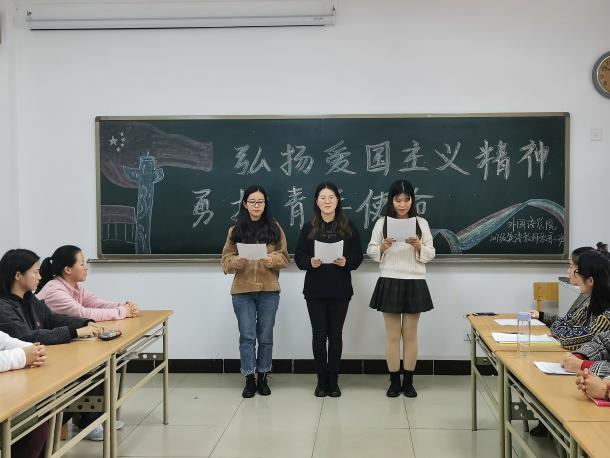 团日活动通过观看短片、主题发言、诗朗诵等多个环节展开,气氛热烈活跃,班内的两位学生以电影《我和我的祖国》为切入点,表达了一代人有一代人的使命,一代人有一代人的担当,为同学们上了一堂精彩的微党课。6位发言的同学结合自己的亲身经历,有家乡精准扶贫带来的改变、参加全国英语演讲比赛的经历、在志愿服务中的历练以及通过全国英语专业四级考试的喜悦。阐释了当代青年从学习中担当、从创新中担当、从实践中担当的理想抱负。主题团日还邀请了两位研究生学姐和一位本科四年级保研的学姐。刘淑君同学给同学们讲述了自己本科毕业后参加研究生支教团,到祖国最需要的地方去的青年责任担当。董晓萌同学分享了自己在美国密苏里州立大学访学一年的见闻,让在场的同学深深感受到了祖国强大带给留学生强烈的民族荣誉感。听到林鑫同学分享的我院9名推免学生全部通过了985、211高校面试顺利录取的消息,在场的同学无不感到身为一名宁大人的自豪和骄傲。