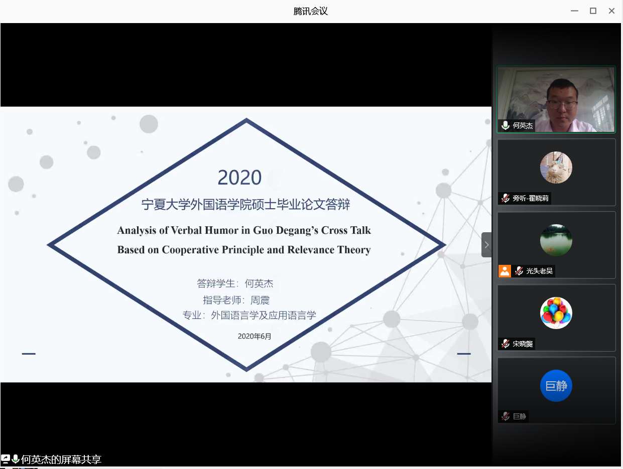 根据学校相关要求,外国语贝宝官网顺利精心组织并顺利完成了2020届硕士研究生的线上论文答辩工作。其中,英语语言文学、外国语言学及应用语言学、口译、笔译和学科教学(英语)专业共56名同学,分别于6月1日、6月2日、6月4日、6月5日共分为8组,以邀请的校外专家老师、校内专家导师作为评委组,有序顺利地进行了线上答辩。