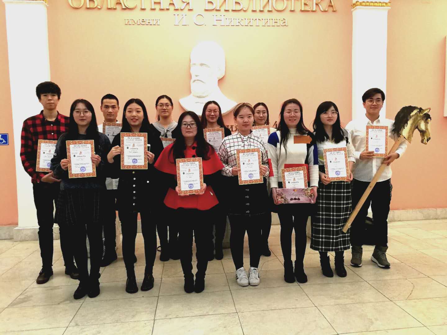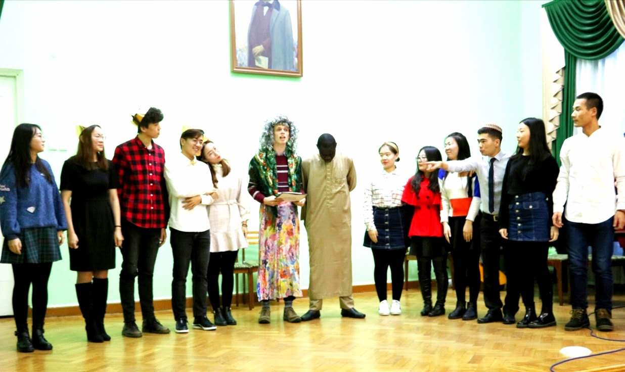 在沃大开展项目评估期间,我校代表团还应邀参加了沃罗涅日大学语言系主办的一年一度的“俄罗斯童话节”活动。这一活动中,俄罗斯的大学生、中小学生、以及各国留学生在同一个舞台上,展示他们精心排演的俄罗斯童话剧。并有多位专家评委现场打分,评选出编排和表演俱佳的演出剧目。“童话节”舞台剧目精彩纷呈,俄罗斯学生和各国留学生风格各异的演出给我校代表团留下深刻印象。最令人欣喜的是,此次“童话节”优秀剧目的评选中,我院2016级俄语专业全体同学演出的童话剧凭借着同学们非常投入的、诙谐幽默的表演和精心的编排赢得了观众的喝彩和评委们的支持,获得了此次“童话节”演出的二等奖。代表团的老师们也从同学们的演出中,看到了他们访学期间取得的显著进步。