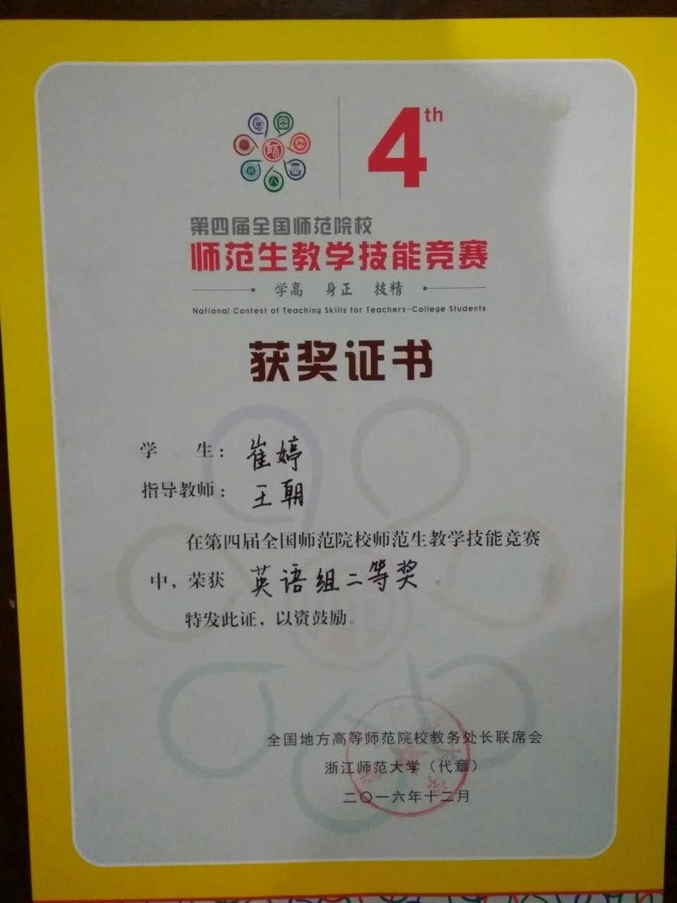 近日,由全国地方高等师范院校教务处长联席会主办,浙江师范大学承办的2016年第四届全国师范院校师范生教学技能竞赛顺利举行,在竞赛中,我院2013级本科生崔婷荣获全国二等奖的佳绩。