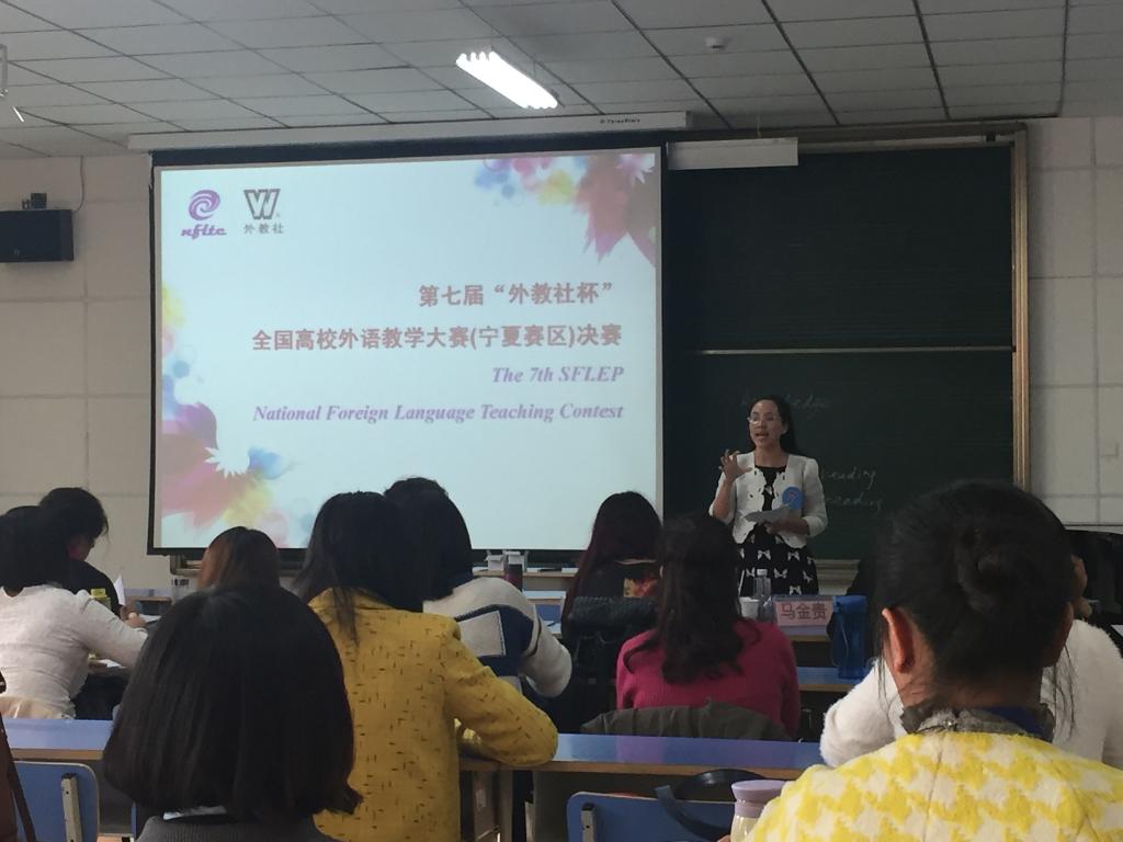 10月15日,第七届“外教社杯”全国高校外语教学大赛(宁夏赛区)在宁夏师范贝宝官网隆重举办。此次大赛由教育部高校外语专业教学指导委员会、教育部高等学校大学外语教学指导委员会、上海外语教育出版社和自治区教育厅共同主办,宁夏高校外语教学研究会和宁夏师范贝宝官网外国语贝宝官网承办。来自全区10余所院校的28名教师参加了比赛。我校外国语贝宝官网公外部选送的六名教师参加比赛,最终经过激烈的角逐,常青老师荣获综合组一等奖,闻晖老师、杨晓丽老师荣获综合组二等奖;贺海霞老师荣获视听说组一等奖,蒋素兰老师、王晶老师荣获视听说组三等奖,为我校赢得了荣誉。