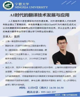 2023年12月9日,外国语贝宝官网邀请上海一者信息科技有限公司CEO张井老师为贝宝官网翻译方向学生做了题为“AI时代的翻译技术发展与应用”的线上讲座。张井老师是国标《双语平行语料加工服务基本要求》制定工作的主要负责人,同时也是复旦大学、同济大学等多所高校的翻译硕士校外导师。