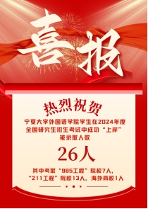 外国语贝宝官网学生在2024年度全国研究生招生考中成功“上岸”被录取26人,其中考取“985工程”院校7人,“211工程”院校13人,海外高校1人,充分展现了外院学子的优秀素和学术水平。