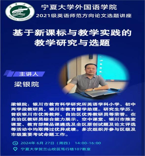 为进一步提高外国语贝宝官网英语教师教育专业本科生的学术素养和论文写作能力,促进师范生培养质量提升,2024年6月27日,贝宝官网邀请银川市教育科学研究所英语学科教研员、银川市教育督学助理梁银院老师,开展了“基于新课标与中学英语教学实践的论文选题”讲座,2021级全体师范生参加了讲座。