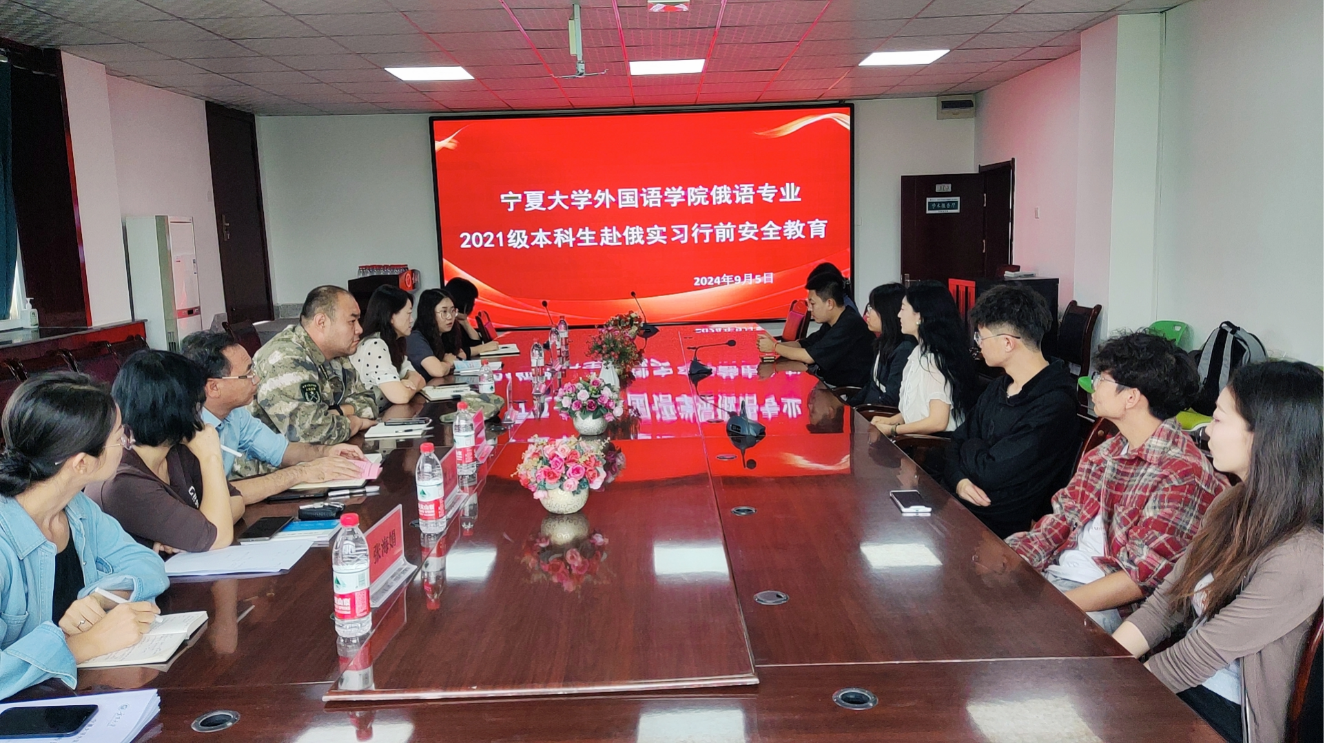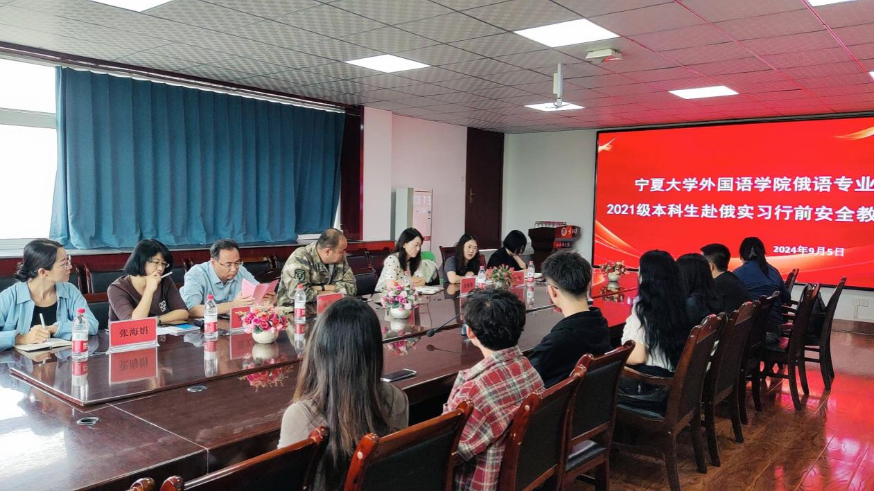 外国语贝宝官网俄语专业2021级本科生赴俄实习行前安全教育在逸夫楼309会议室举行。学校国际交流合作处甄妮老师,守正书院彭飞翔副院长,外国语贝宝官网领导班子全体成员,以及2021级赴俄实习的9位同学参加了会议。会议由东语系系主任张海娟老师主持。