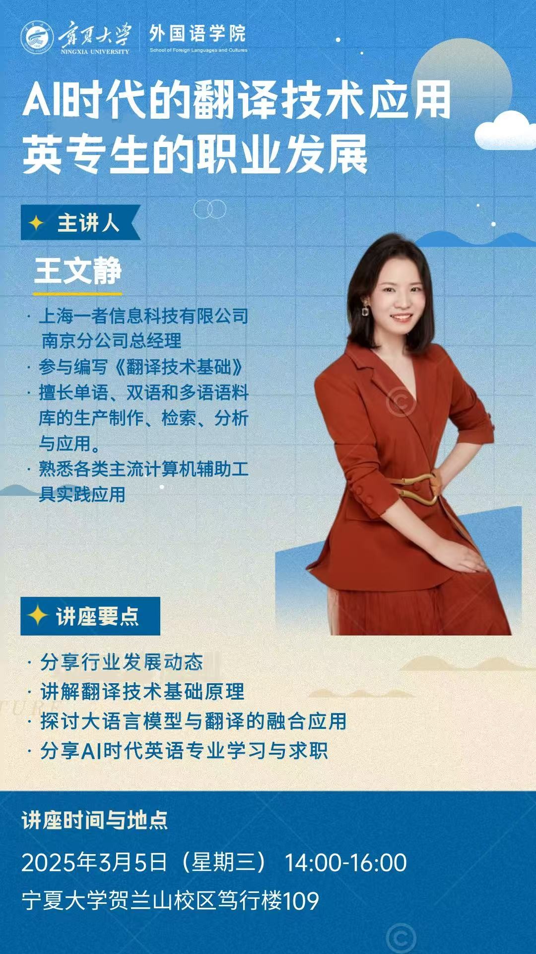 贺兰山校区笃行楼109教室举办了一场专为翻译专业学生量身定制的讲座,主题为“AI时代的翻译技术应用与英语专业学生职业发展”。