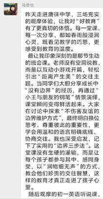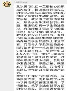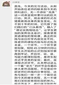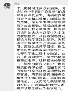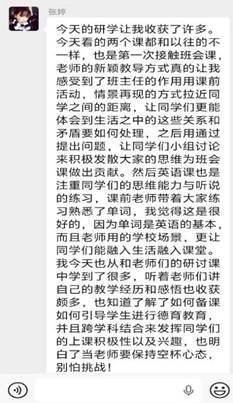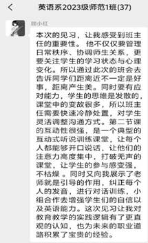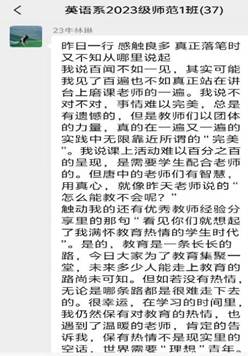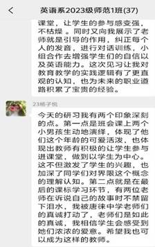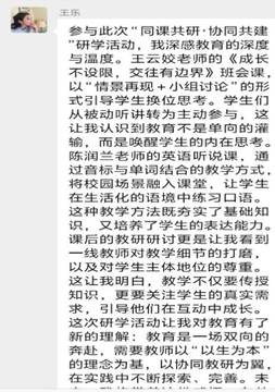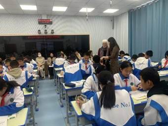 最令师范生感触深的是教研活动环节。在纳老师领学师德师风和新课标的相关文件后,七年级备课组长梁老师介绍了集体备课的经验和成果。在对陈润兰老师的展示课评课过程中,其他老师的点评真诚且有针对性,提出的五点建议让师范生看到一节课多次打磨后依然有提高的空间。外国语学院师生积极参与研讨,Smith博士肯定了课堂活动的效果,李艳、牛林琳、于成龙、徐哲四位师范生也现场分享了这次见习的收获与感悟。