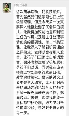 通过在宝湖校区的现场研讨和紧随其后的班级反思反馈,师范生对课堂细节的关注与把握、教学效果观察、活动时间分配有了更直观的感受和深刻认识;研讨也激发了他们对教学理论的指导与创造性应用的认真思考。