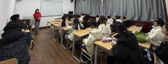 师范生们认真观摩、细致记录,对教师在课堂中运用的“全英沉浸式教学”“情境教学”及“多媒体融合”等教学策略印象深刻。观摩结束后,班主任宋晓龑老师带领参与本次见习活动的学生进行教学研讨,师范生围绕本节课的教学设计、课堂实施与教学效果进行多角度剖析。有同学注意到张老师采用了“先泛读把握整体,再精读聚焦细节”的阅读教学路径,她认为这种循序渐进的安排符合学生的认知规律,有助于学生逐步构建对文本的理解。另有同学则进一步补充,他认为本课的泛读环节设计尤为出色,通过快速浏览、预测等策略,有效激活了学生的背景知识,为后续的精读活动做好了铺垫。多位同学对课堂活动的多样性与现代教育技术的应用表示赞赏。有同学指出,教师不仅运用了小组讨论、情景模拟等丰富形式,其PPT课件制作精良,关键信息突出显示,配合敦煌壁画的高清图片和短视频,营造了沉浸式的学习氛围,给人耳目一新之感。还有同学观察到,张老师在处理重难点词汇时,并非孤立讲解,而是结合课文语境引导学生跟读和体会,并在学生发言后能进行精准的总结与提升,体现了良好的课堂互动与语言产出。同学们特别钦佩张老师本身的专业素养。大家谈到,张老师口语流利,教态亲切自然,面对学生的不同反应能够灵活应对,其即时、具体、富有鼓励性的课堂评价有效激发了学生的参与热情。在同学们分享讨论环节后,宋老师在总结中指出,此次研讨不仅在于评课,更在于引导同学们将观摩实践与所学理论相印证,反思如何将优秀教师的教学智慧转化为自身成长的养分。她鼓励同学们今后在教学设计中,要像张老师一样,注重文本的深度解读、活动层次的递进以及育人价值的自然渗透。
