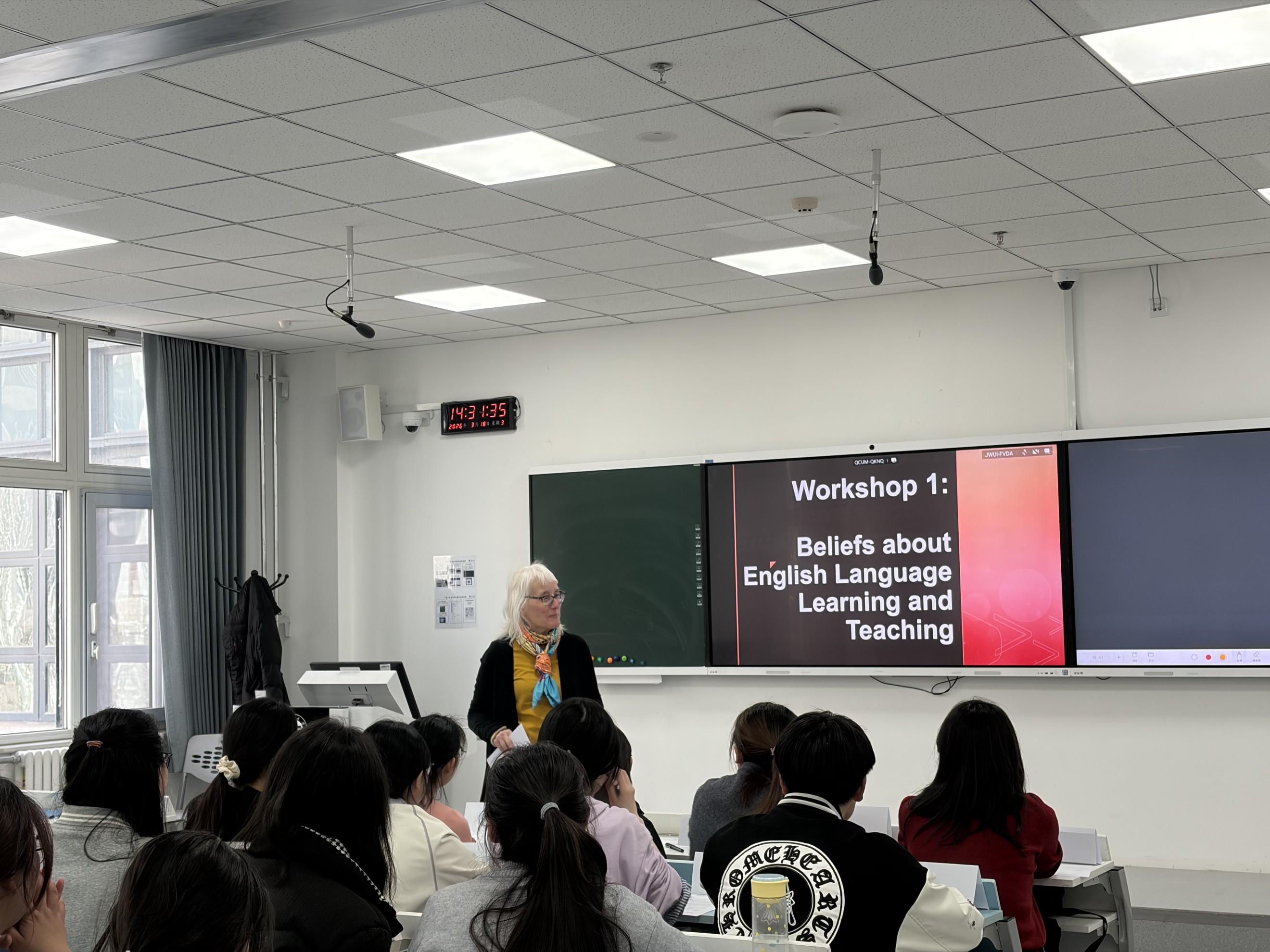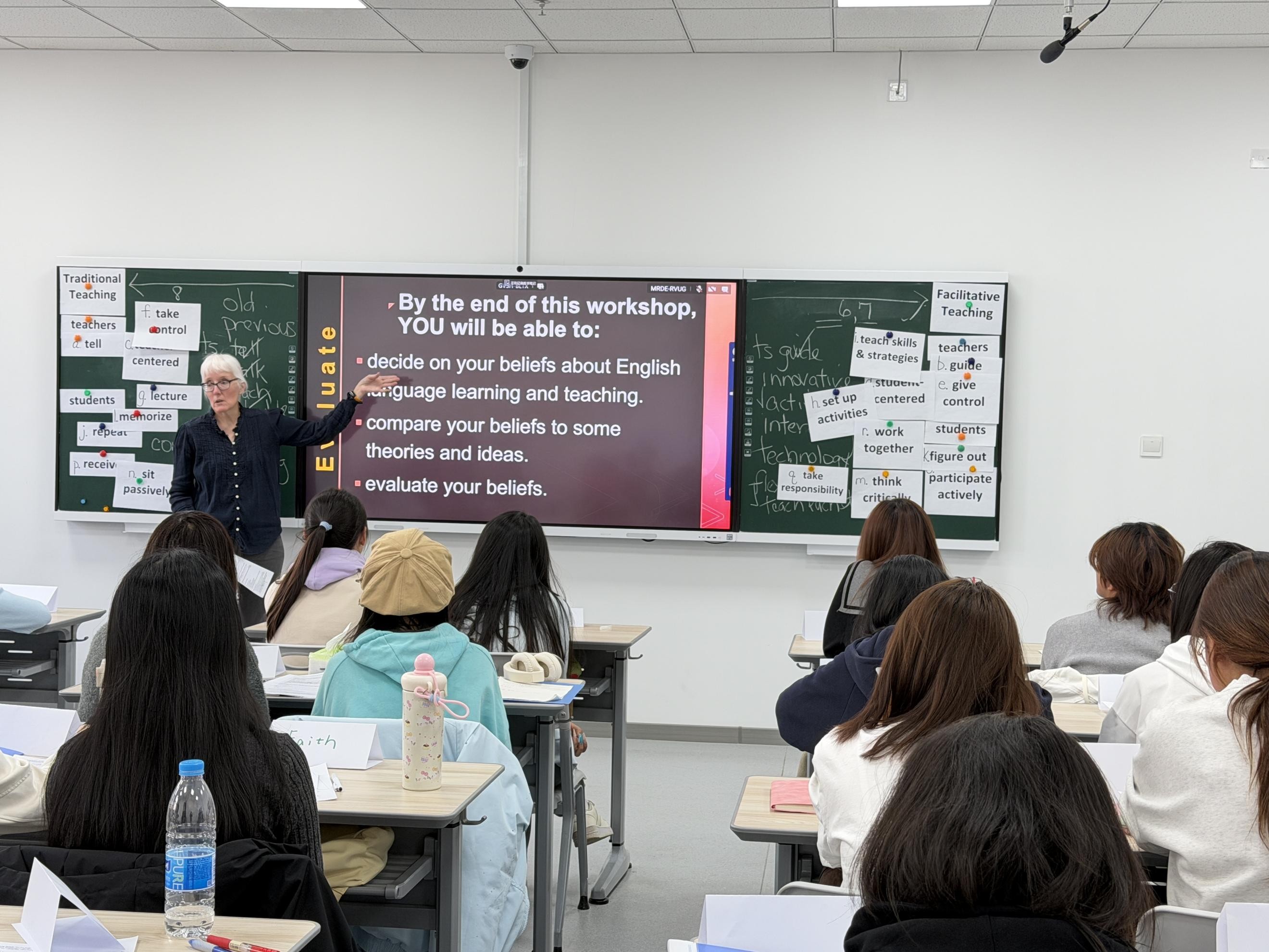 3月18日与3月23日下午,外国语学院在贺兰山校区笃行楼207教室和407教室,分别为2025级英语师范1班和2班学生举办了“卓越教师培养计划”首场教学工作坊。本次工作坊以“Beliefs about English Language Teaching and Learning”为主题,特邀英语教学法领域专家Melissa K. Smith博士主讲,旨在引导未来教师审视并重构自身教与学的信念,为后续课堂实践与教学研究奠定扎实基础。