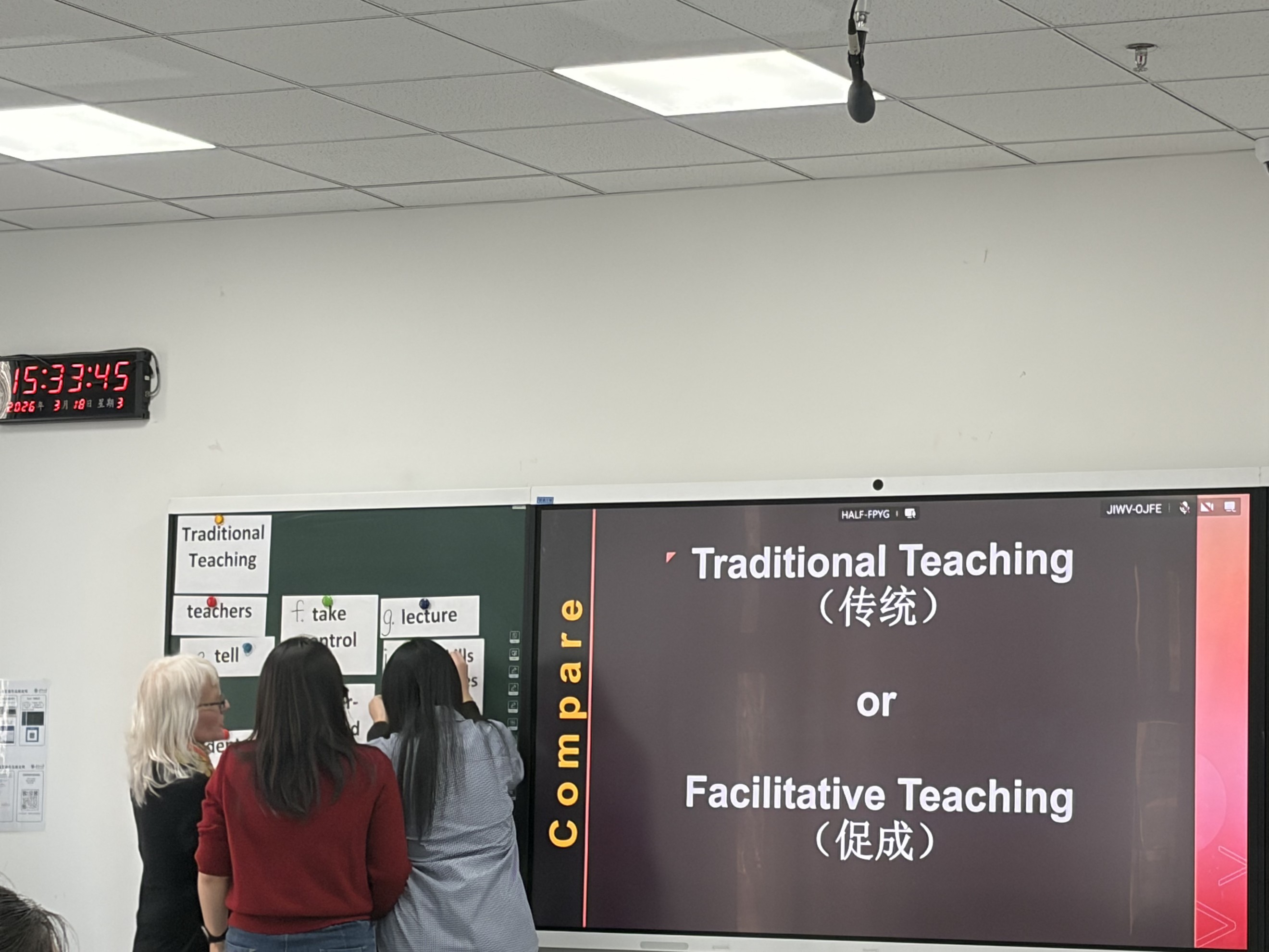 工作坊围绕“探究教学信念:传统教学与促进式教学(Traditional vs. Facilitative)”这一主线,采用讲授、小组讨论、问卷自评与反思写作相结合的形式,将“认识教学信念”这一抽象议题转化为具体可操作的学习任务。通过理论讲解与多元实践环节的有机融合,活动帮助师范生厘清不同教学理念的内涵,同时借助自评与反思训练,为其后续课堂观察、教学实践与教学研究做好了方法与理念上的准备。