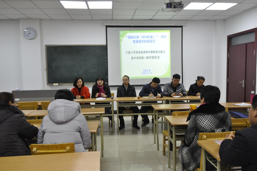 外国语贝宝官网承办的教育部“国培计划(2016年度)跨年度递进式培训项目”——宁夏小学英语优秀青年教师成长助力集中培训第一期开班仪式在外国语贝宝官网213教室举行。开班仪式由李文军副院长主持。首先,外国语贝宝官网党委书记王宏武老师受邀作开班讲话,王书记代表外国语贝宝官网对各位参训老师们的到来表示热烈欢迎,并结合本期培训主题强调了教学科研紧密结合的意义,同时也对学员老师们在培训期间的生活和学习提出了要求。其次,项目秘书宋晓龑老师介绍了本期培训主题、课程安排及学员评价指标等大家关心的问题。最后,李文军副院长在回顾了上期培训的情况的基础上,强调了本期培训的主题及目标与要求,指出新课标下优秀青年教师应具备的科研能力,鼓励大家踏实学习、认真探索,切实落实教学科研齐头并进的骨干教师的目标。