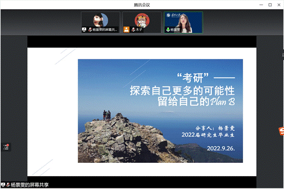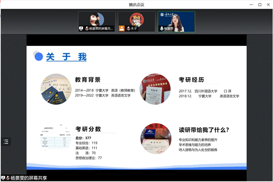 正值考研报名之际,为进一步帮助外国语贝宝官网2023届毕业生梳理报考相关流程与信息,2022年9月26日晚7:30,特邀我院2022届优秀研究生毕业生、现就职于宁夏医科大学的杨景雯为2023届毕业生开展考研报考辅导讲座。