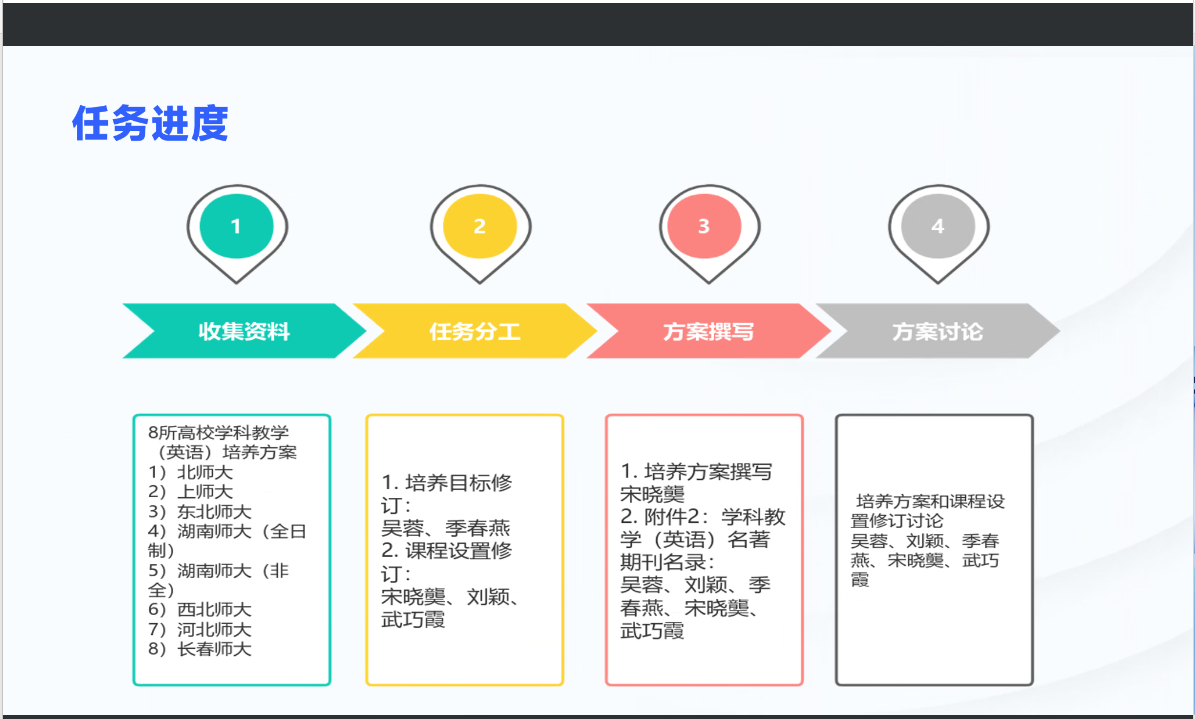 会议开始,胡笑瑛副院长介绍了本次修订工作的具体情况。接着,各学位点负责人汇报了培养方案修订情况。宋晓龑副教授、胡笑瑛教授、朱海燕副教授依次介绍了学科教学(英语)、外国语言文学及翻译硕士培养方案的修订情况。与会教师就课程设置类型及课程名称等细节展开热烈讨论。会议的最后,贝宝官网执行院长刘艳晖对培养方案修订工作的进一步推进提出了意见和建议。